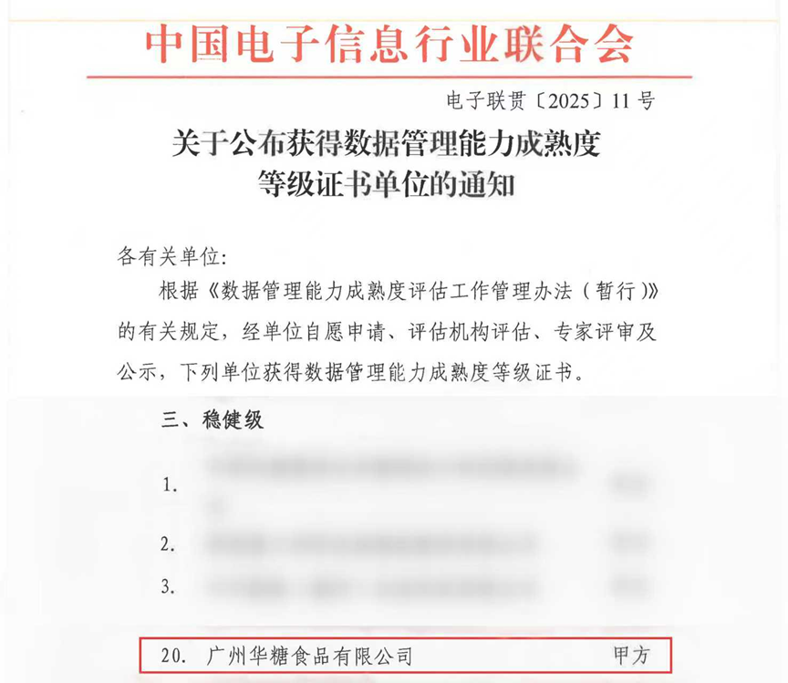 近日,中国电子信息行业联合会正式公布新一批数据管理能力成熟度评估模型(DCMM)贯标等级企业名单,红棉股份旗下华糖公司凭借扎实的数据管理实力,顺利通过评审,荣获DCMM三级(稳健级)认证!
