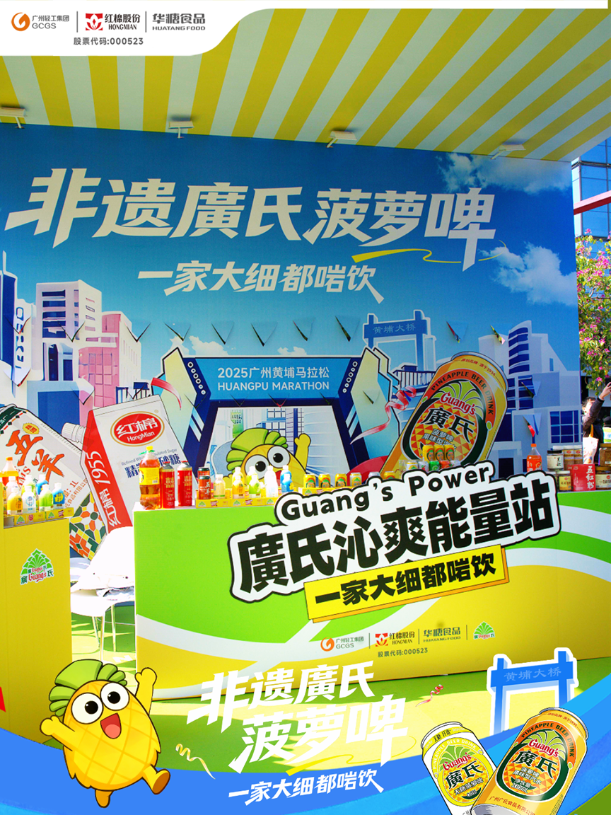 当蓝紫色的人潮在绿轴广场奔涌蓄势,一抹亮眼的跃动黄映入眼帘,正是广州轻工集团旗下红棉股份子公司华糖食品的廣氏菠萝啤。